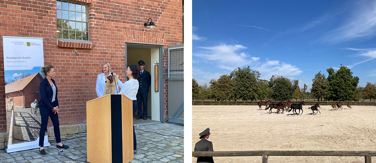 Ein weiterer sanierter Paddock im Hauptgestüt Graditz wurde am vergangenen Donnerstag, 28.09. feierlich eingeweiht. Nach einem kleinen Schauprogramm übergaben die Sataatssekretärin im Sächsischen Staatsministerium für Energie, Klimaschutz, Umwelt und Landwirtschaft Gisela Reetz gemeinsam mit der Niederlassungsleiterin des SIB Leipzig II Petra Förster das Gebäude an die Landstallmeisterin der Sächsischen Gestütsverwaltung Dr. Kati Schöpke.